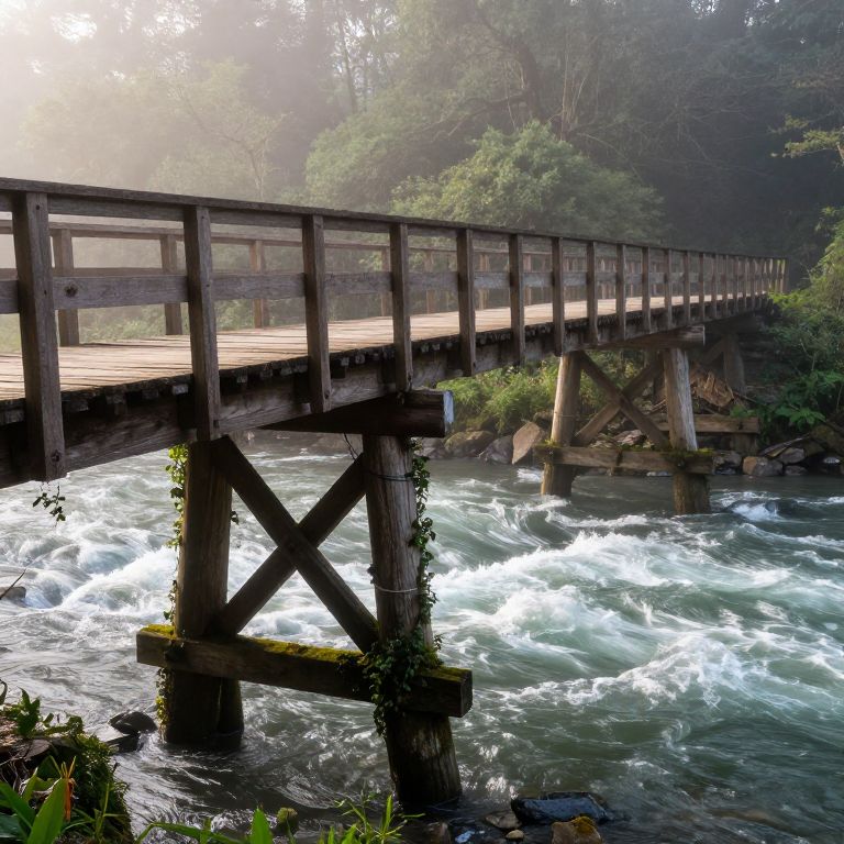 Durable wooden bridge spanning a turbulent river, old yet sturdy structure with visible grain and knots, moss and vines growing alongside, misty forest background, soft morning light illuminating longevity and natural robustness.