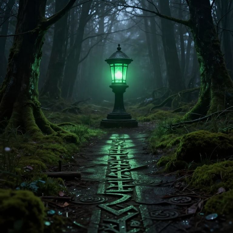 Mysterious, glowing green lantern on a wet, moss-covered path in a dark, foggy forest, with intricate stone patterns reflecting light.