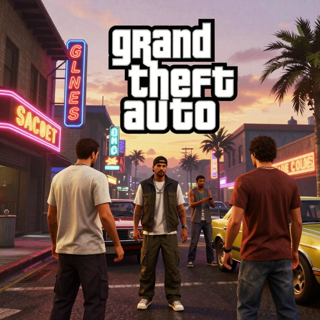 Photograph-style digital art of four men in casual attire standing on a neon-lit urban street at sunset, with "Grand Theft Auto" text overlay