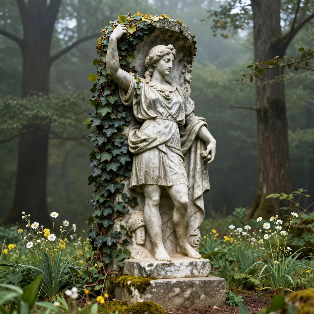 The figure of Germania depicted as a heroic statue emerging from the mist, carved from stone and ivy-covered, set in a lush forest clearing with moss and wildflowers, soft natural lighting evokes a sense of history and myth, photorealistic style with high detail.