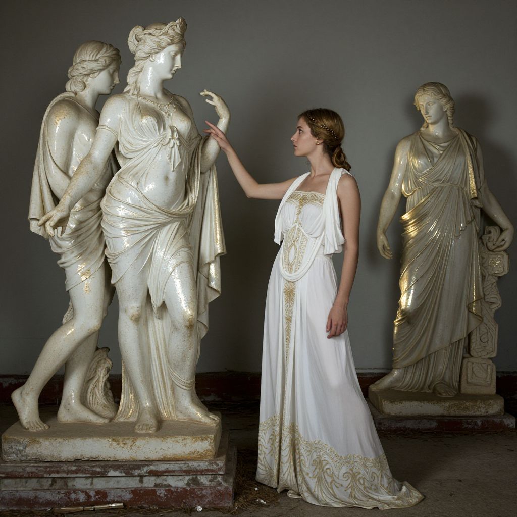 Photograph of a woman with light brown hair, wearing a white, sleeveless, Greek-style gown with gold embroidery, standing in front of three classical marble statues. She gently touches the arm of the statue on the left with her right hand. The statues, also white with gold accents, depict classical figures in draped robes, standing in a dimly lit room with a grey wall background. The woman's gold headband matches the gold details on the statues. The floor is concrete, and the statues are on rectangular stone pedestals. The scene evokes a sense of ancient Greek or Roman art.