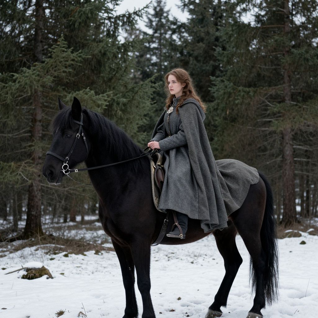 Photograph of a fair-skinned woman with long, wavy brown hair, wearing a grey, medieval-style cloak and riding a black horse. The horse has a black mane and tail, and is equipped with a simple bridle featuring a silver ring. They are in a snowy forest with tall, dark green pine trees in the background. The woman sits upright and looks forward, holding the reins with both hands. The ground is mostly white snow with patches of brown earth visible. The lighting is natural, with an overcast sky, giving the scene a slightly muted, wintery feel.