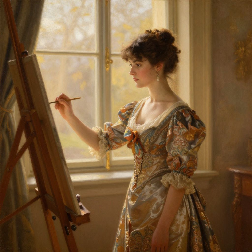 Beautiful Victorian woman painting at an easel by a large window, dressed in elegant silk with intricate patterns, golden hour sunlight streaming in, detailed textures of fabric and wood, oil painting style with atmospheric depth and refined brushstrokes.