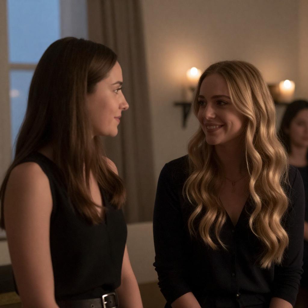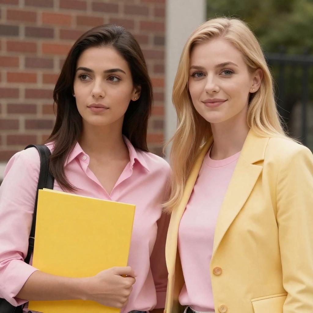 Photograph of two women in a brightly lit room with red bookshelves. The blonde woman on the left wears a blue button-up shirt and looks at the woman on the right, who has brown hair in a bun, wears black sunglasses and a black mesh top, gesturing with her hands. The shelves are filled with books and DVDs.