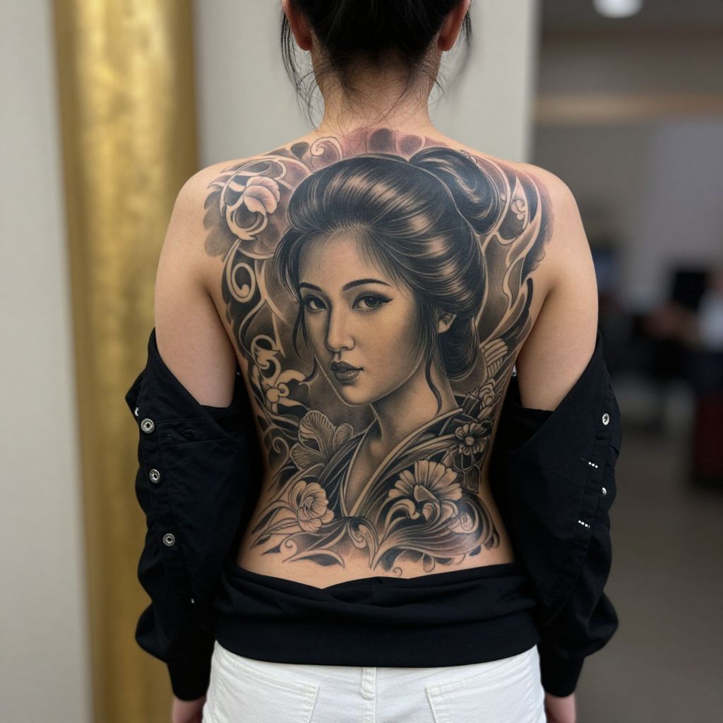 Photograph of a person with long black hair, sitting with their back facing the camera, showcasing a vibrant, intricate tattoo covering their entire back. The tattoo features a colorful, anime-style woman with long black hair, surrounded by swirling patterns and pink flowers. The person is in a tattoo studio, with wooden furniture and a mirror in the background. The tattoo has a vivid, traditional Japanese style.