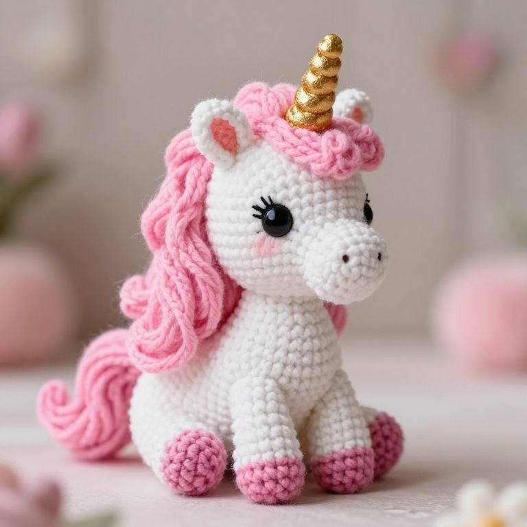 A whimsical crochet unicorn, adorned with a vibrant pink mane and a golden horn, sits serenely in a cozy, dreamlike setting, embodying the enchantment of a magical wonderland.
