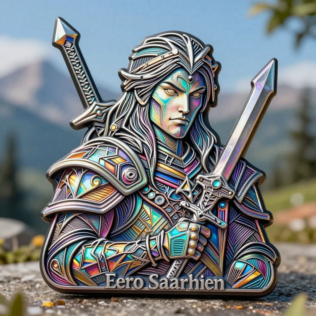 Digital artwork of a stylized, armored warrior with long, flowing hair, reminiscent of the character Link from "The Legend of Zelda" series. The warrior, depicted in vibrant, iridescent colors, holds a glowing sword in their right hand and a sheathed sword on their back. They are positioned in a mountainous, blurred forest background. The armor features intricate, geometric patterns, and the character's expression is determined. The text "Eero Saarinen" is centered at the bottom. The overall style is a blend of fantasy and modern digital art, with a focus on bold lines and vivid, reflective colors.