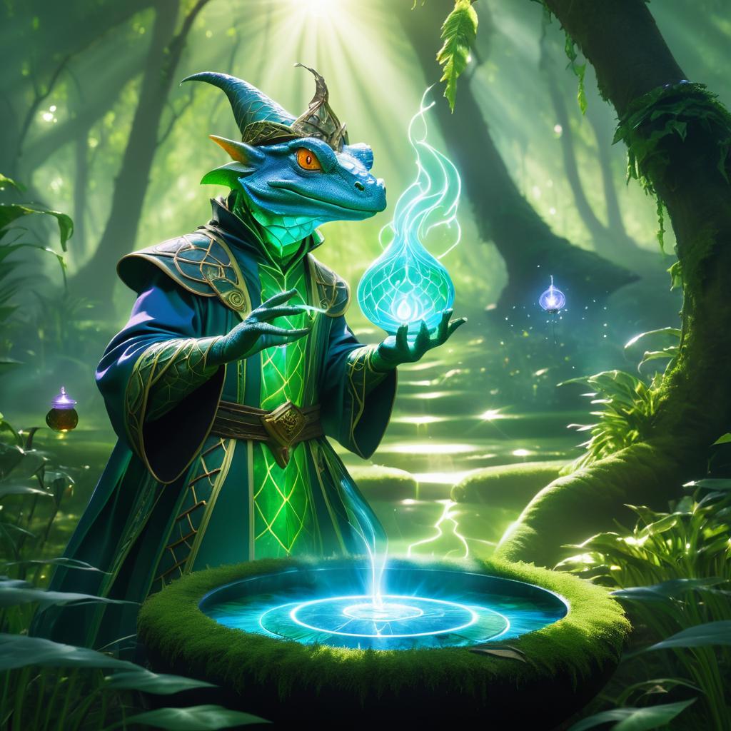 A detailed digital artwork of an anthropomorphic lizard dressed as a conjurer, standing in a sunlit magical forest glade. The lizard figure wears a green and blue robe with intricate golden patterns and holds a glowing, green mystical potion vessel, with light and magical energy emanating from it. Surrounding are lush forest plants and diffuse volumetric lighting highlighting the fantasy scene. Styled in a cinematic fantasy art style reminiscent of Magic: The Gathering.