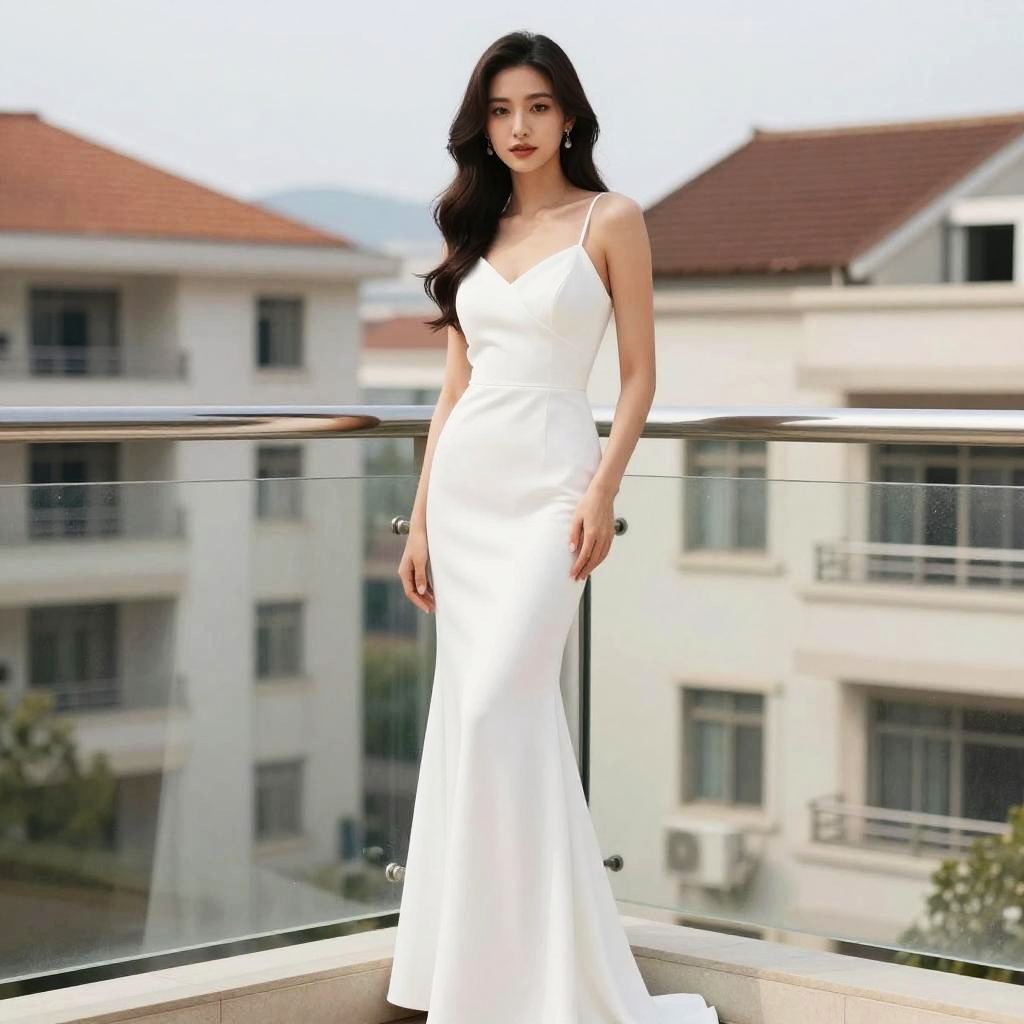 A young Asian woman with long, wavy black hair wearing a white, fitted formal dress with thin shoulder straps. She is standing on a glass-railed balcony with modern buildings in the background, showcasing a stylish and sophisticated look.