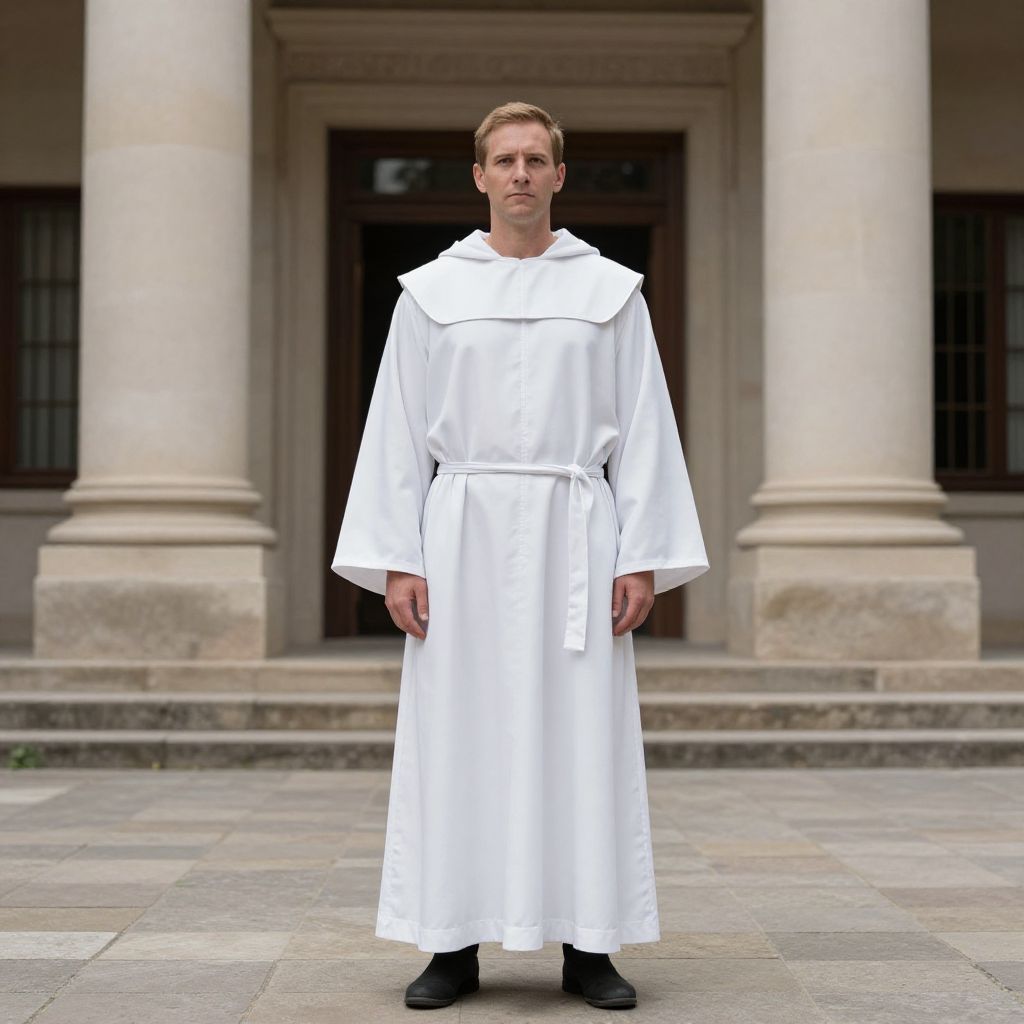 White Monk Costume, man in white robe standing in front of a building