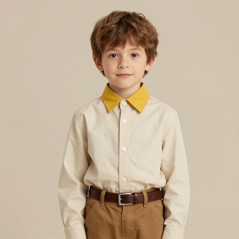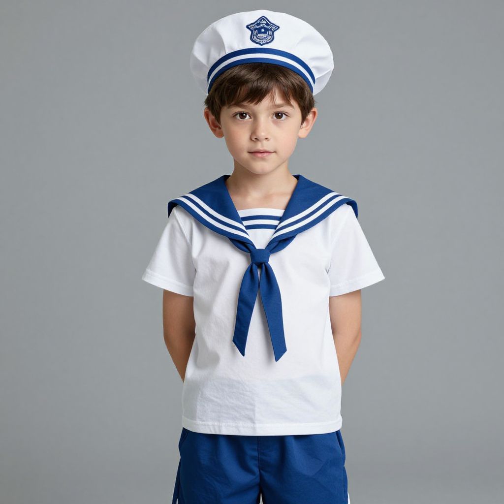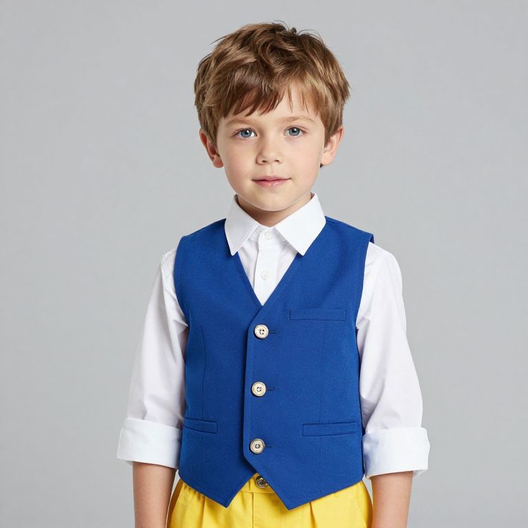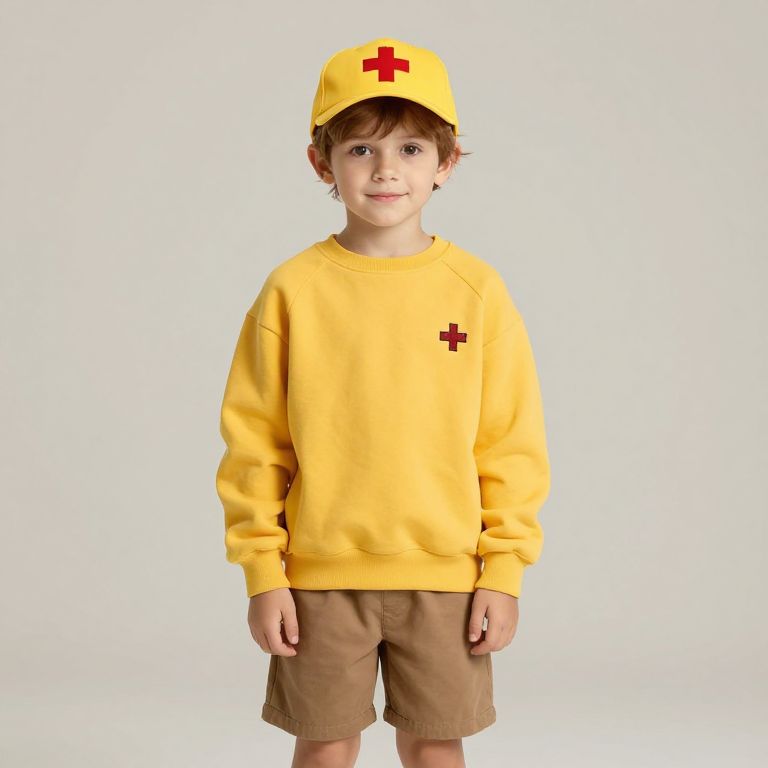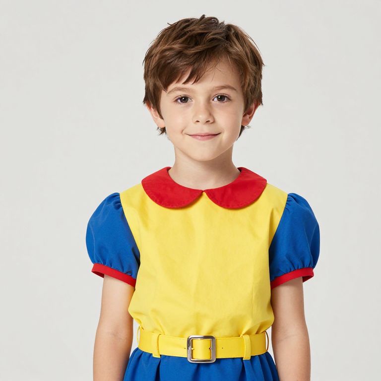Boy with blonde hair, wearing a green and yellow outfit with a yellow skirt.