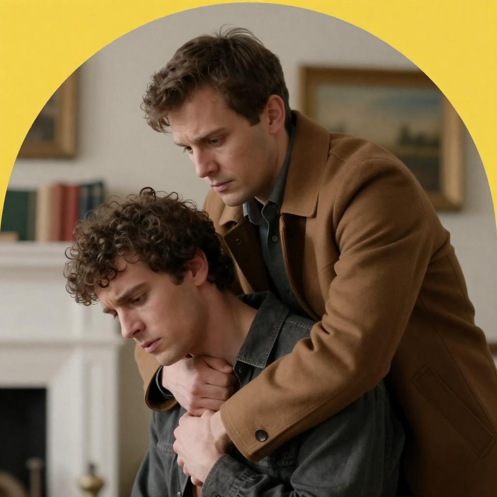Photograph of two men in a tiled kitchen. The standing man, with black face paint and a brown jacket, holds the chin of the seated man, who has light brown hair and wears a blue jacket. The standing man wears yellow gloves. The seated man looks up at the standing man. Kitchen background includes a floral tile, bottles, and a table.