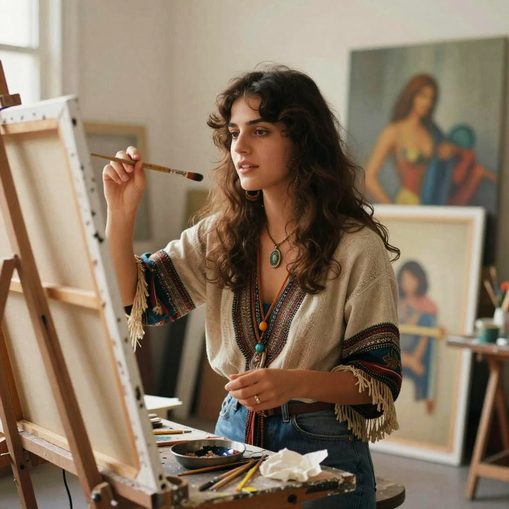 Photograph of a young woman with long, wavy brown hair painting in a brightly lit studio. She has a medium tan skin tone and wears a white, bohemian-style blouse with colorful, patterned trim and fringe, paired with high-waisted blue jeans. She holds a paintbrush in her right hand, poised above a canvas on an easel. A green pendant necklace rests on her chest. On the easel, there's a partially finished painting of a woman with similar features. In the background, two more paintings of women are visible, one slightly blurred. The studio has white walls and natural light streaming in from the left.