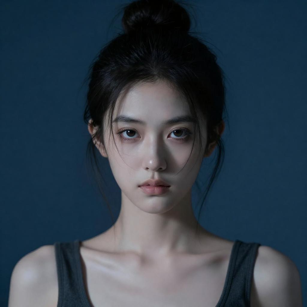 Photograph of a pale-skinned woman with long, dark, slightly messy hair and blue eyes. She has a serious expression and is wearing a white, sleeveless top. The background is a soft, gradient blue. Her hair partially covers her right eye. The lighting is even, highlighting her facial features.