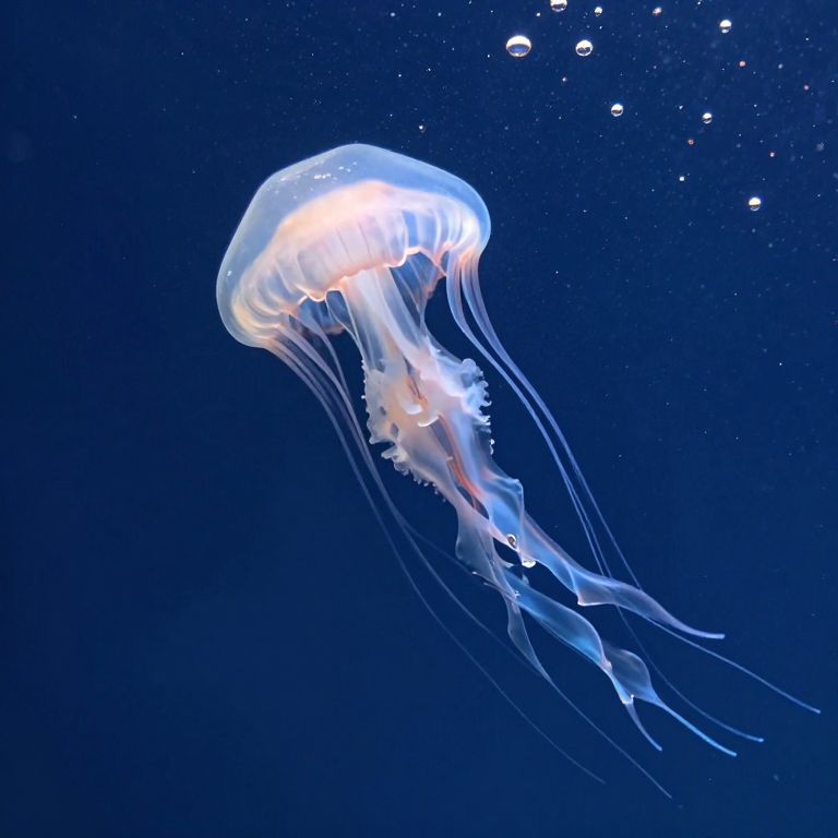 Jellyfish gracefully drift in a serene underwater scene, their translucent bodies illuminated by soft light filtering through the deep blue water, surrounded by delicate streams of bubbles rising toward the surface.