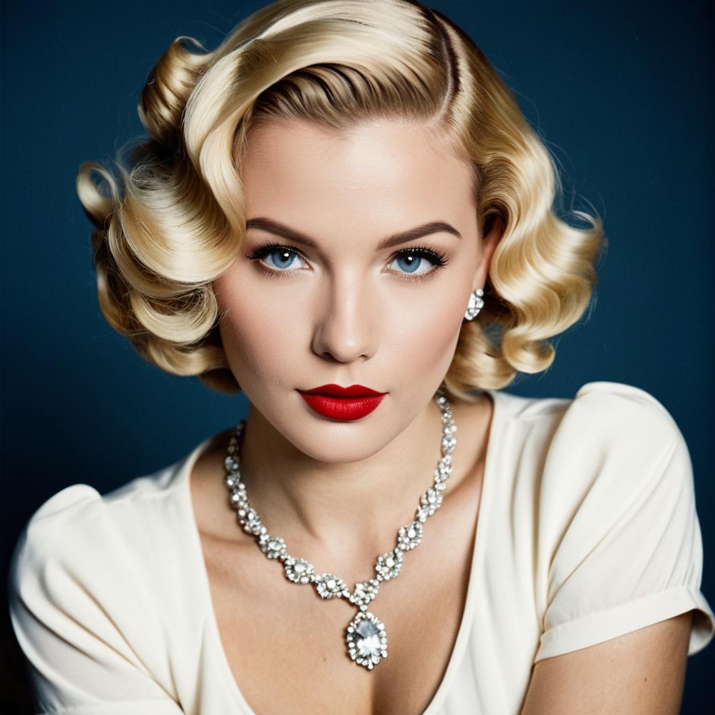 Blond finger wave wig hair,1girl, solo, jewelry, blue eyes, blonde hair, necklace, makeup, red lips, realistic, looking at viewer, upper body, short hair, lipstick, curly hair, short sleeves, lips