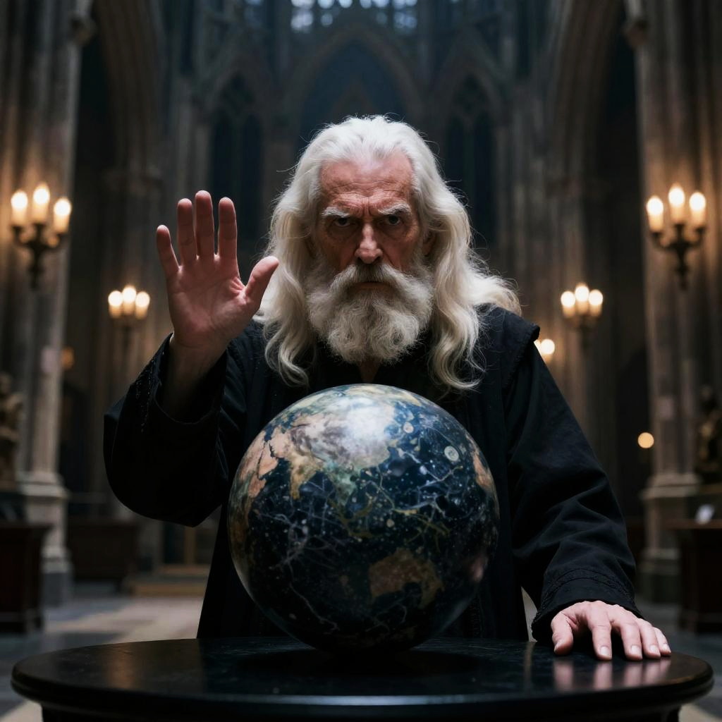 Old man with long white hair and beard, intense expression, right hand raised, palm facing forward, large marbled planet on black table, dark gothic cathedral background, beams of light, multiple ornate hanging lamps.