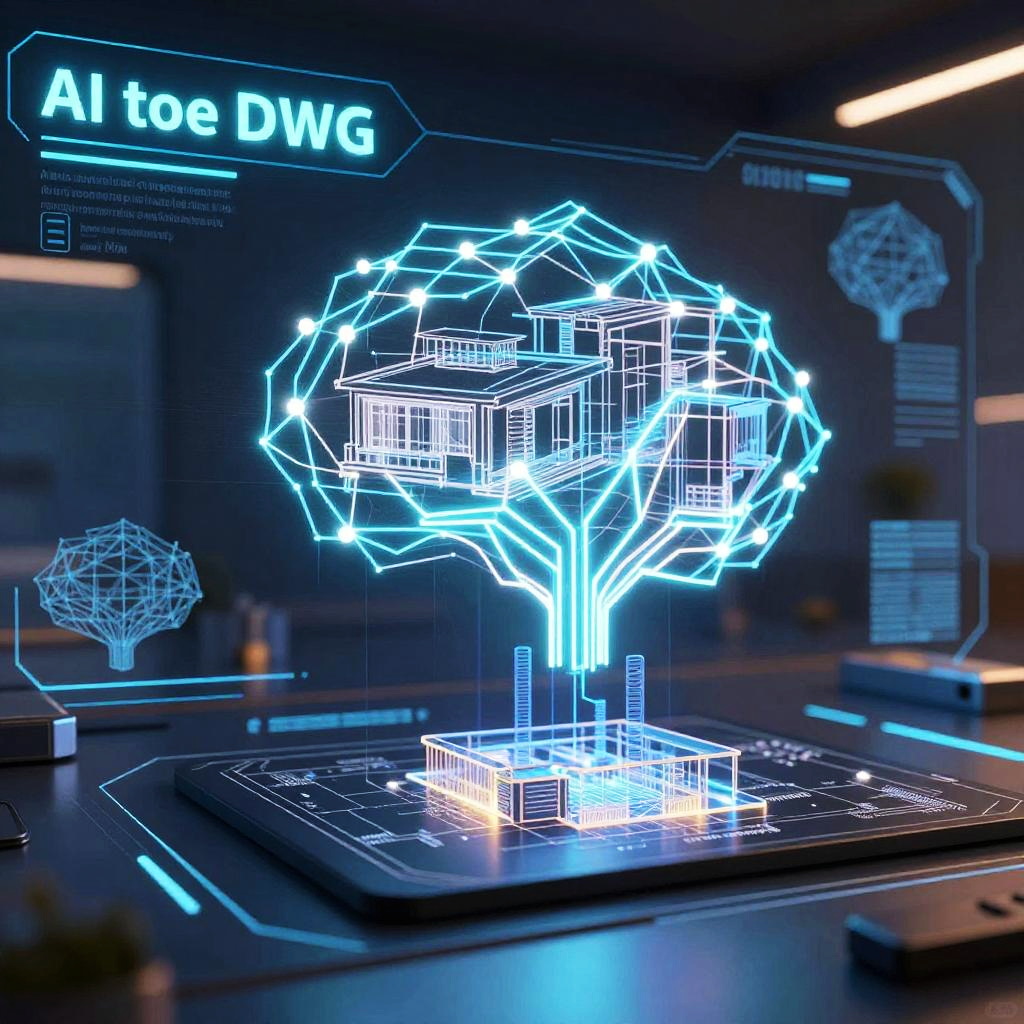 AI to DWG conversion process depicted as futuristic digital interface with glowing neural networks transforming complex architectural designs into detailed DWG blueprints, high-tech environment, vibrant colors, cybernetic style.