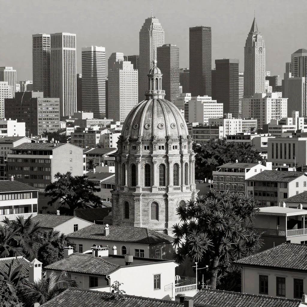 This black-and-white photograph features a cityscape of a bustling urban area with a prominent historical dome building in the foreground. The dome, likely a church or cathedral, stands out with its detailed architecture and central spire. Surrounding the dome are various modern buildings, including tall skyscrapers with distinct, sharp lines and a mix of rectangular and angular shapes. The background includes a cluster of high-rise buildings, creating a dense, urban skyline. In the foreground, there are smaller, more traditional buildings with tiled roofs and palm trees interspersed among them, adding a touch of greenery. The overall contrast between the old and new architecture is striking.