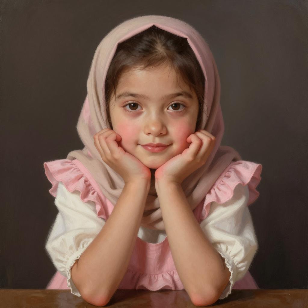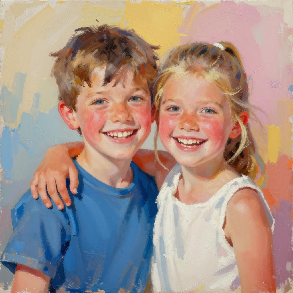 Realistic painting of a woman with long brown hair and a young boy with curly blonde hair. Woman gazes at boy, who looks up at her with a slight smile. Woman's right hand gently touches boy's collar. Background has ured blue and gray brushstrokes. Woman's face is close to boy's, showing affection. Boy wears light blue shirt, woman wears white blouse. Both have soft, warm expressions. Artist uses detailed brushwork.