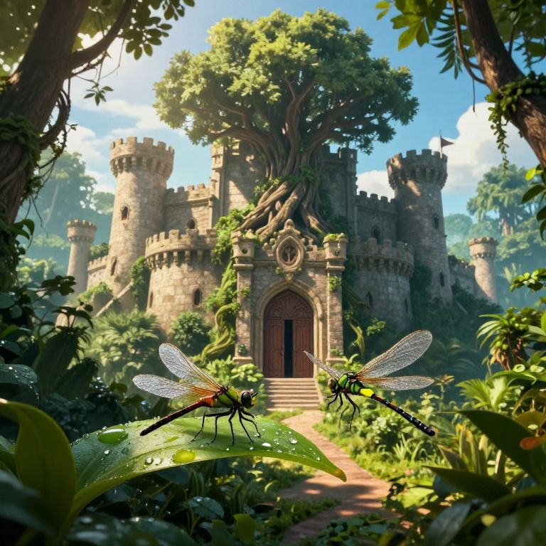Photorealistic digital art: Enchanted castle with turrets, overgrown with lush greenery, and two delicate dragonflies on a sunlit