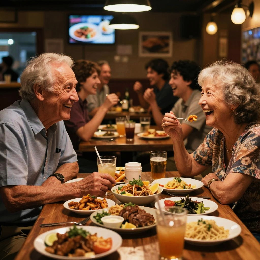 Realistic photo.Elderly man and woman in a bar filled with food, warm lighting, vibrant atmosphere, people laughing and enjoying themselves, diverse spread of food across the table, slightly blurred background, detailed expressions of joy, ultra-detailed, cozy and inviting scene for social gatherings realistic photo