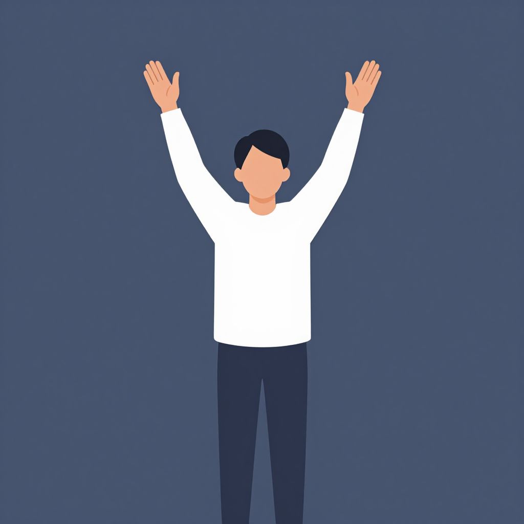 Digital illustration of a simplified, faceless person with short black hair, wearing a white long-sleeve shirt and dark blue pants, raising both arms