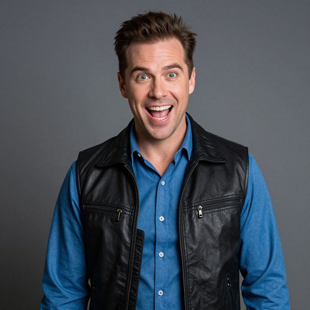 Photograph of a Caucasian man with short, spiked brown hair and blue eyes, smiling widely with his mouth open, displaying teeth. He wears a blue denim shirt under a black leather vest with visible stitching. The background is a plain, dark gray, providing contrast to his brightly lit face and clothing. The image has a sharp, professional quality, capturing his lively expression and casual style. The man's skin is fair, and his overall appearance is youthful and energetic.