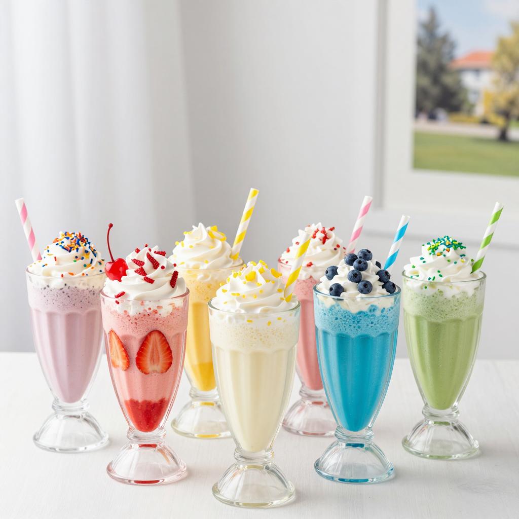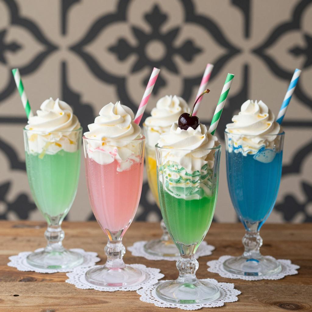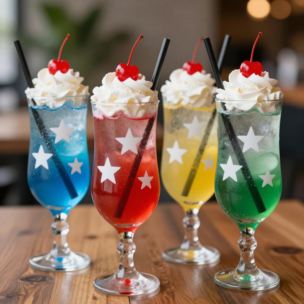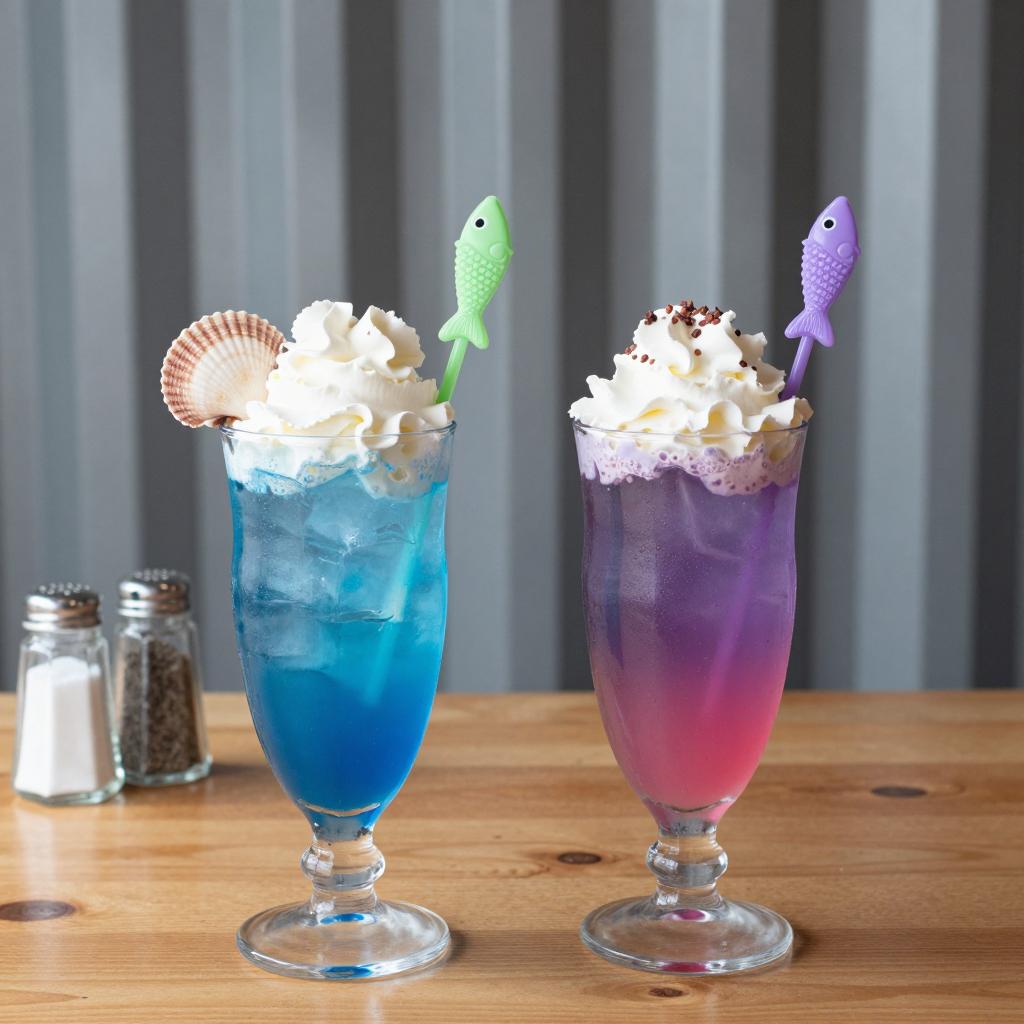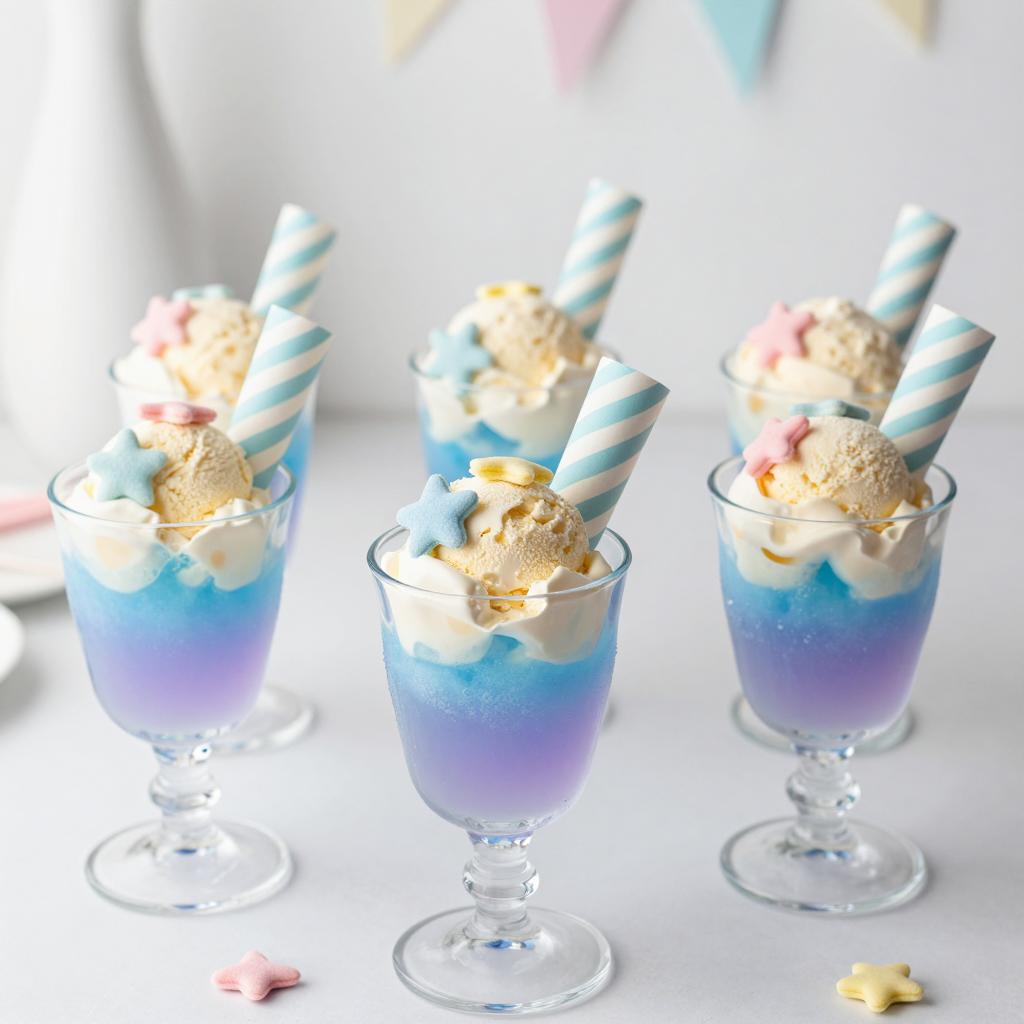 Six tall, clear fluted glasses filled with colorful blue, purple, and pink gradient drinks. Each glass has a white layer on top, adorned with starfish, pastel-colored meringues, and small edible glitter. Background is blurred white and light blue.