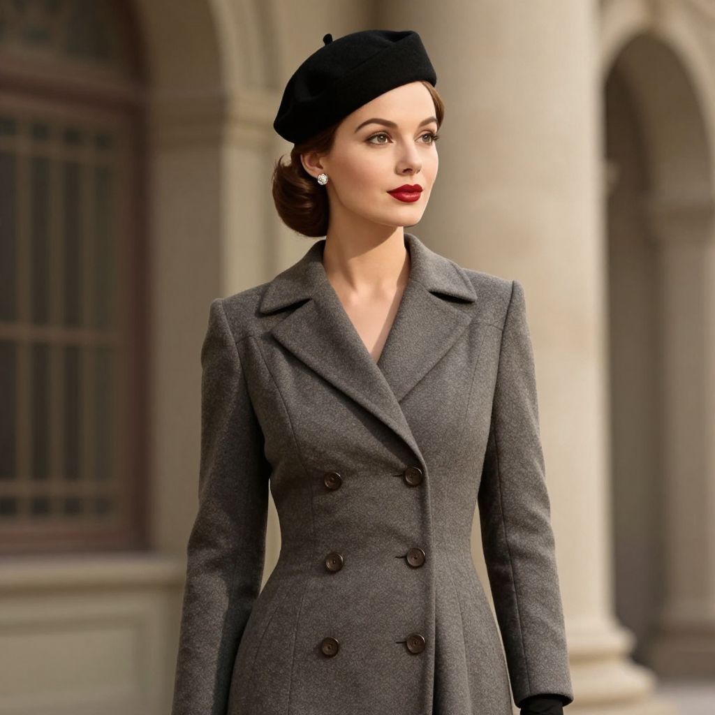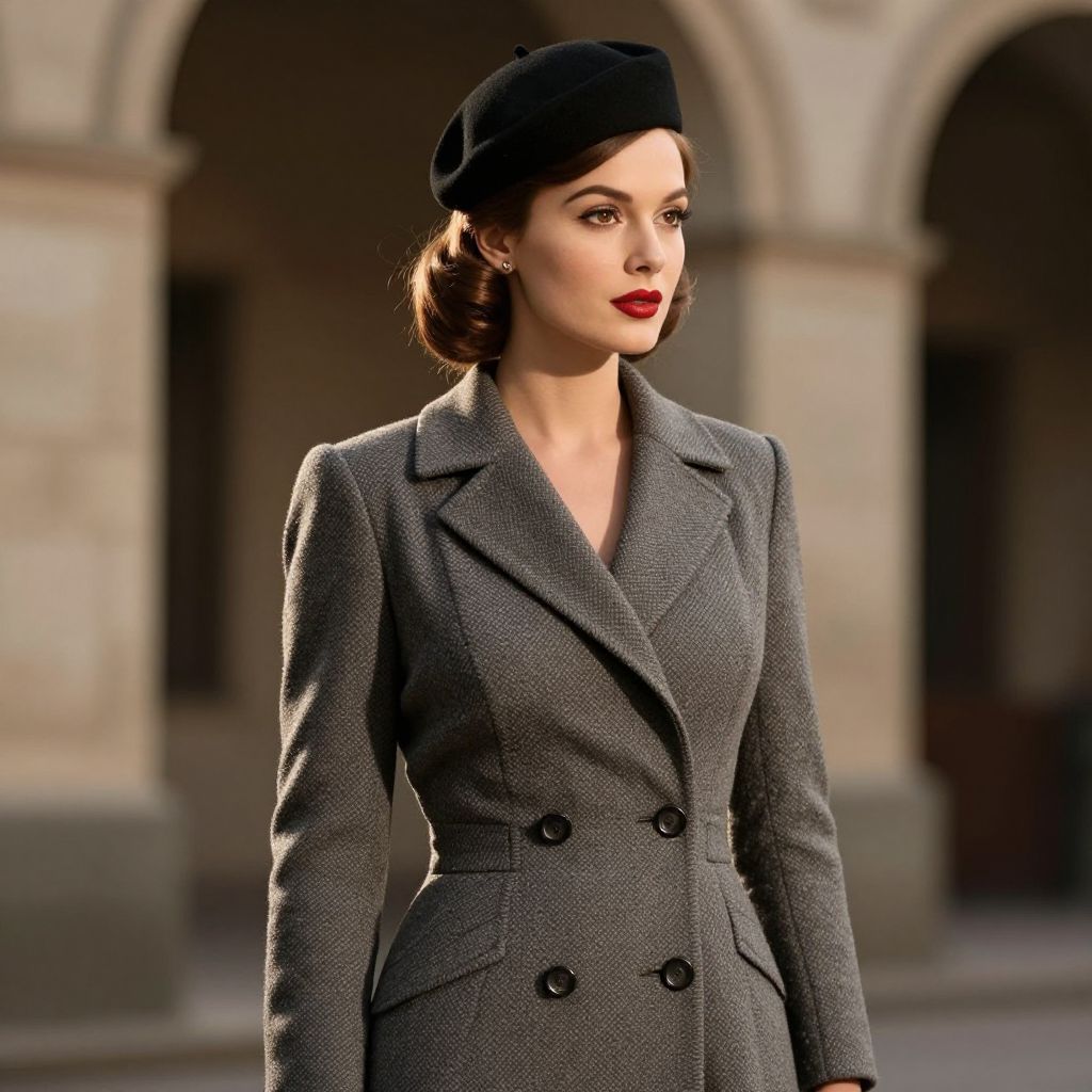A high-definition, retro-inspired digital illustration captures a woman in classic 1940s fashion, featuring a tailored double-breasted coat, a stylish beret, and elegant accessories, set against a vintage architectural backdrop with dramatic lighting effects.