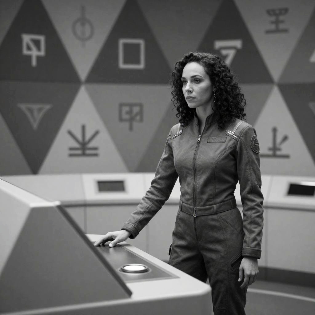 Black and white photograph of a woman in a futuristic, geometrically patterned room. She stands at a large, triangular control console with her left hand on it. Her hair is curly, and she wears a detailed, form-fitting jumpsuit with patches on the sleeves. The background features repetitive triangular panels with various symbols. The console has a circular button and a display screen. The woman looks to the right, her expression neutral. Multiple triangular panels with symbols are behind her.