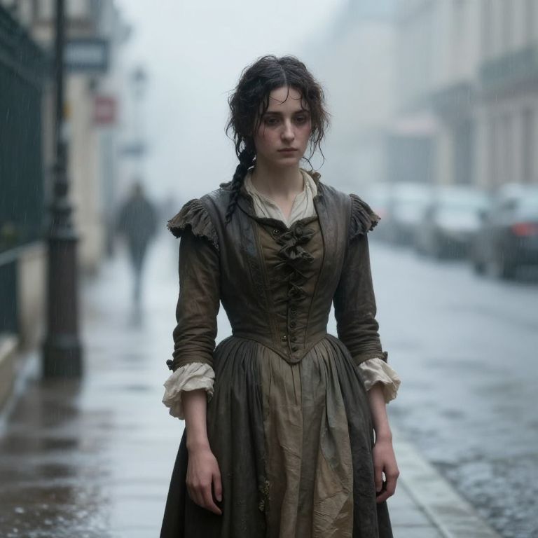 Eponine standing on a misty Paris street at dawn, wearing a tattered 19th century dress, soft rain falling, somber expression, muted color palette, impressionist style with delicate brush strokes and a focus on melancholy atmosphere.