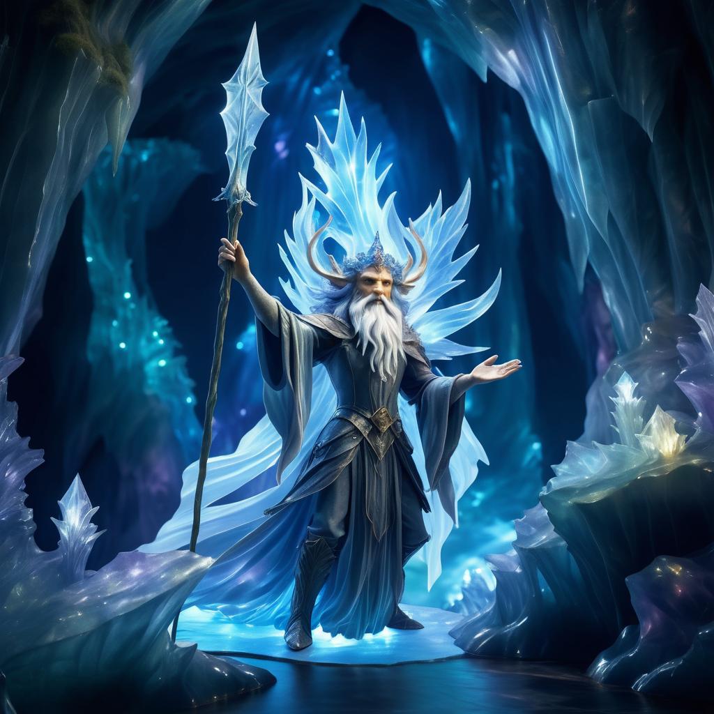 A mystical scene featuring a transforming humanoid creature adorned in elegant, golden armor inside a luminous crystal cave. The creature is holding a tall staff with a radiant, translucent blue winged entity waving like a flag. The environment is filled with glowing blue crystals and ethereal light, creating a surreal and magical atmosphere.