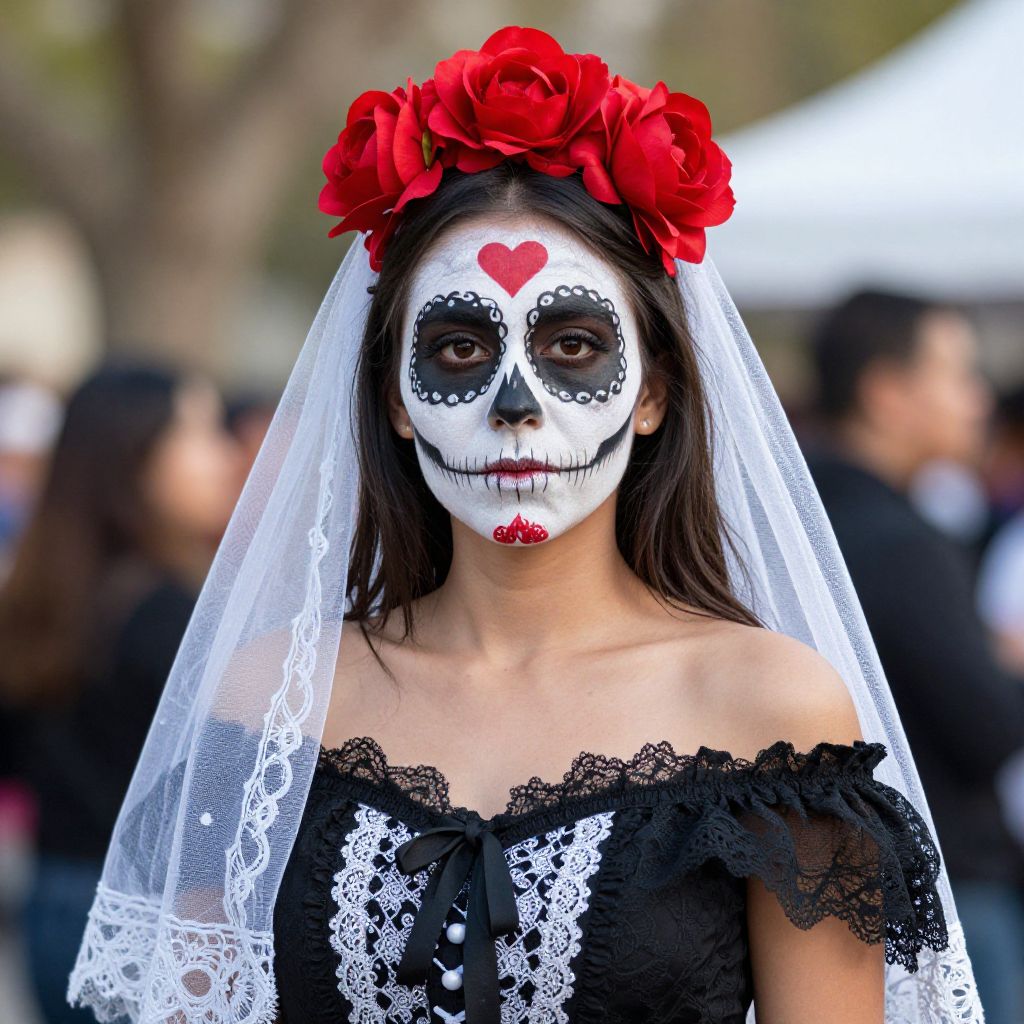 Photograph of a young woman with light brown skin and dark brown hair, wearing a black lace off-the-shoulder dress and a white lace veil. Her face is painted white with black lace-like patterns around the eyes, nose, and mouth, resembling a sugar skull, and features a red heart on her forehead and red lips. She has a red rose flower crown in her hair. The background is blurred, showing other people and white tents, suggesting an outdoor event. The image has vibrant colors and a festive, cultural vibe.