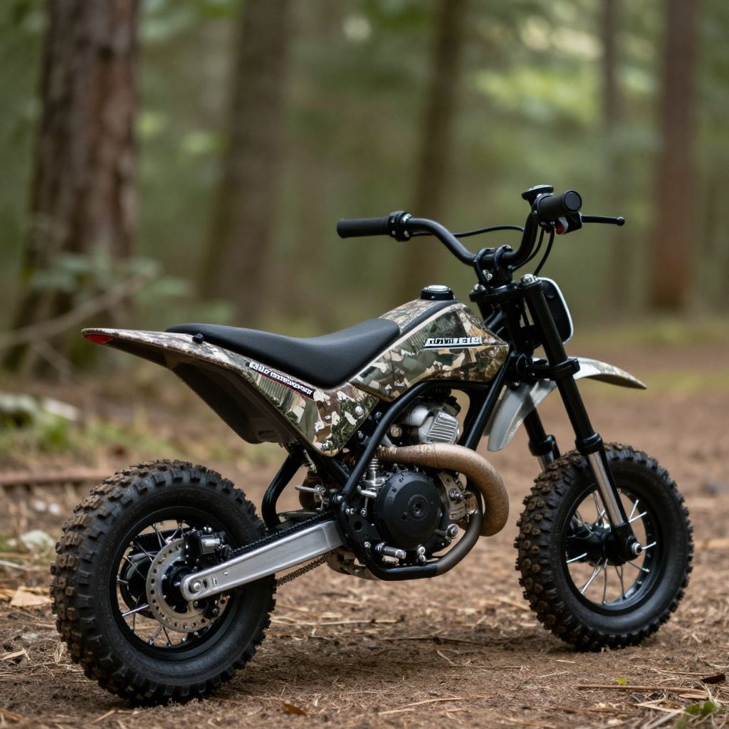 Photograph of a camouflage-patterned dirt bike with black tires and exhaust, parked on a forest dirt path, surrounded by tall trees.