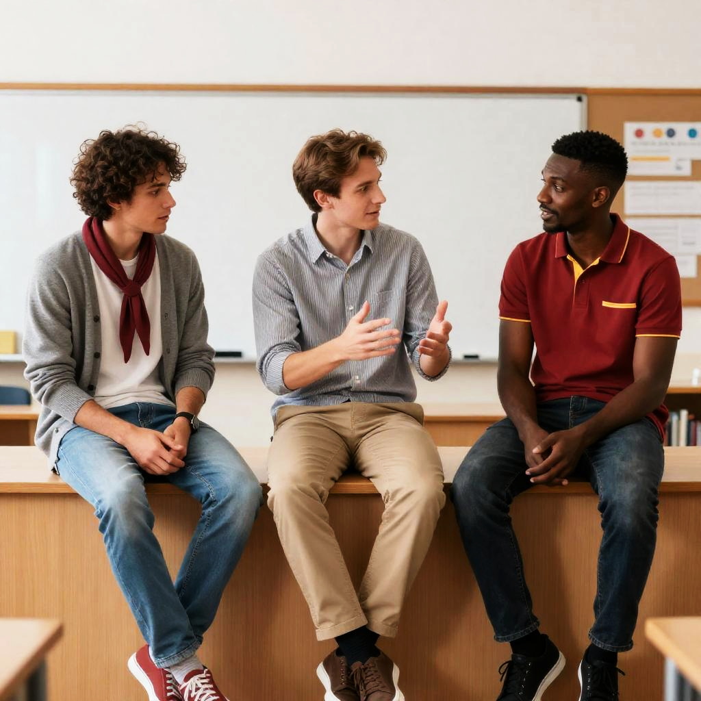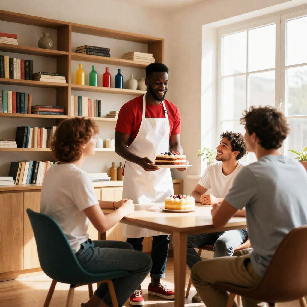 Photograph of a cozy room with wooden shelves filled with books and colorful bottles. A tall Black man in a red-striped shirt, white apron, and red sneakers holds a tray with a cake. Two white men sit at a table; one smiles, the other looks at the cake. Bright sunlight streams through large windows. A teal chair and wooden chair are visible.