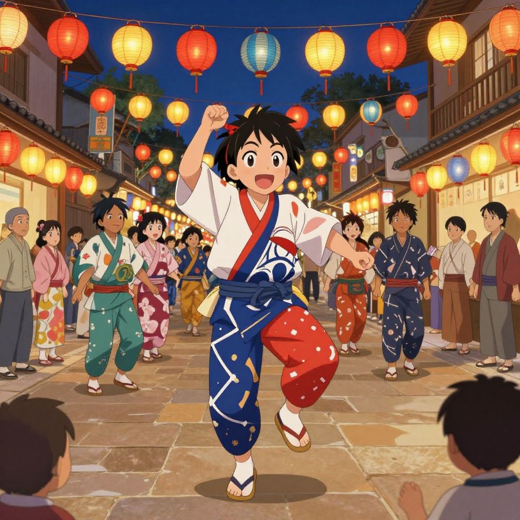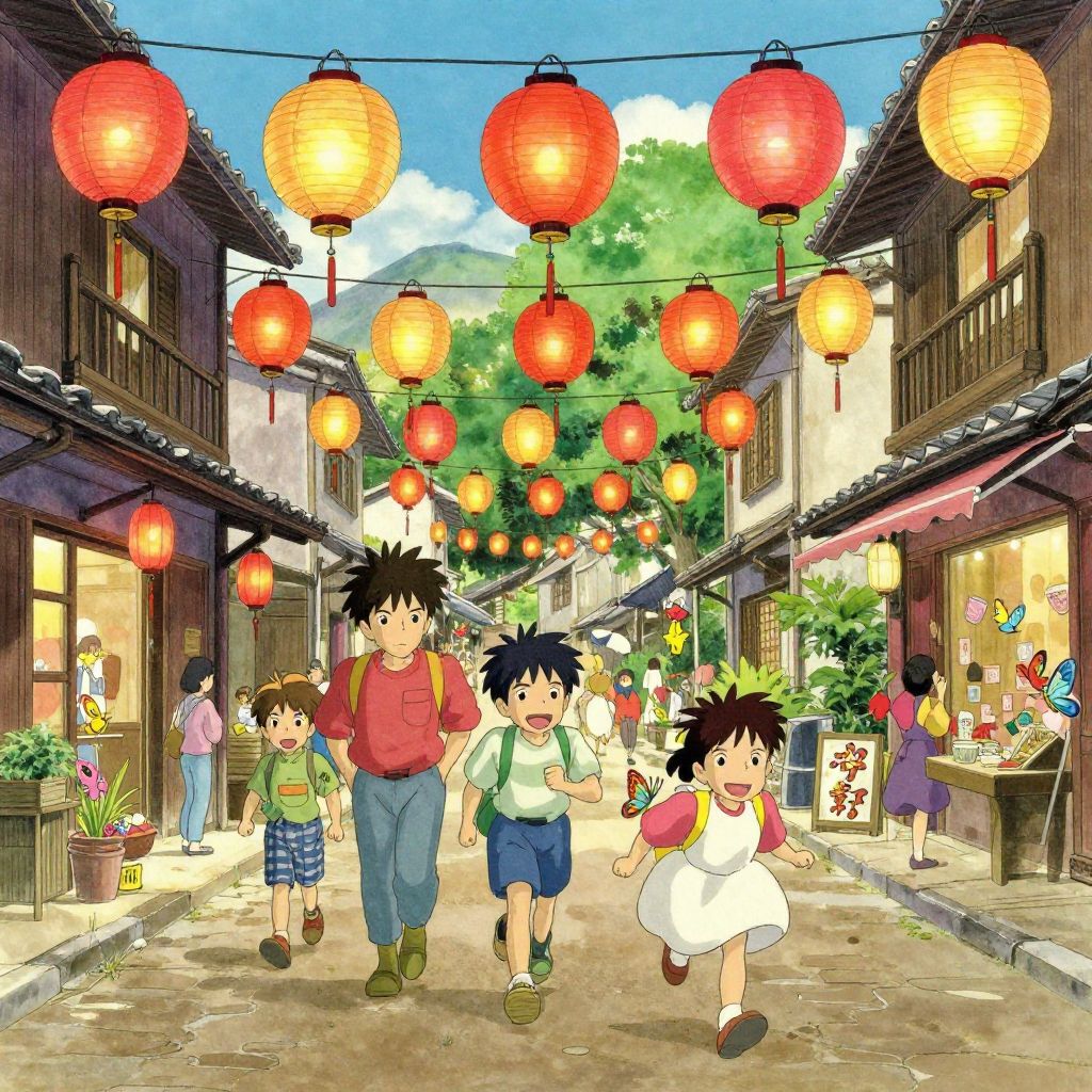 Ghibli art style bustling village street during spring festival, vibrant paper lanterns glowing, children chasing colorful butterflies, expressive characters with hand-drawn charm and vivid watercolor backgrounds