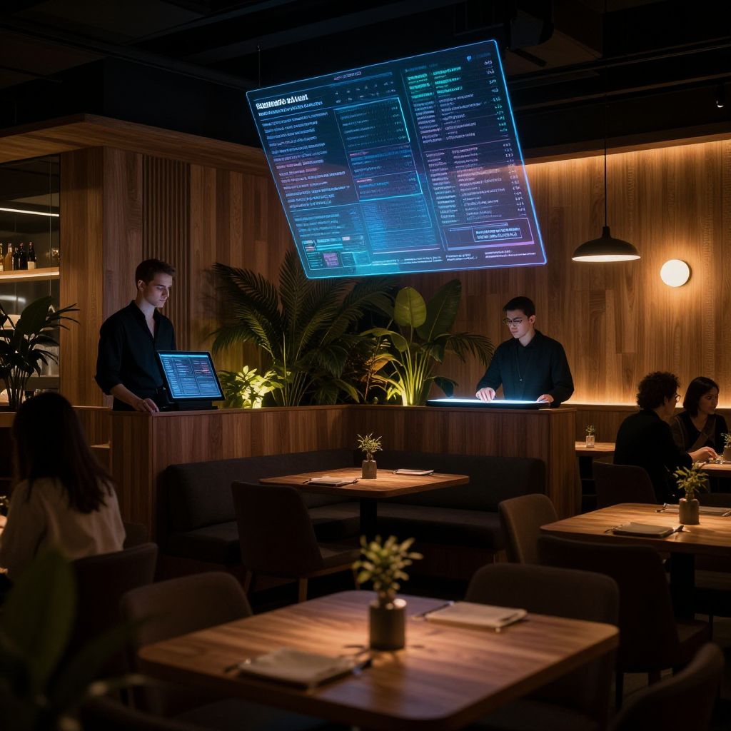 Night cafe AI scene with holographic menus floating above tables, patrons interacting with AI-powered servers, dim atmospheric lighting, sleek modern interior with plants and warm wood textures, a blend of human and machine harmony