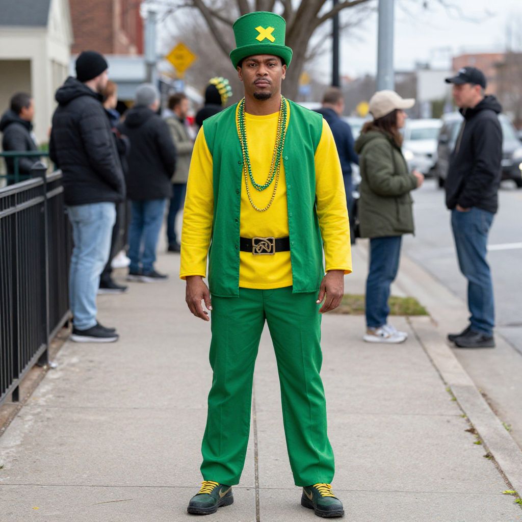 Mardi Gras Festival Costume, dressed in a green and yellow costume standing on a sidewalk