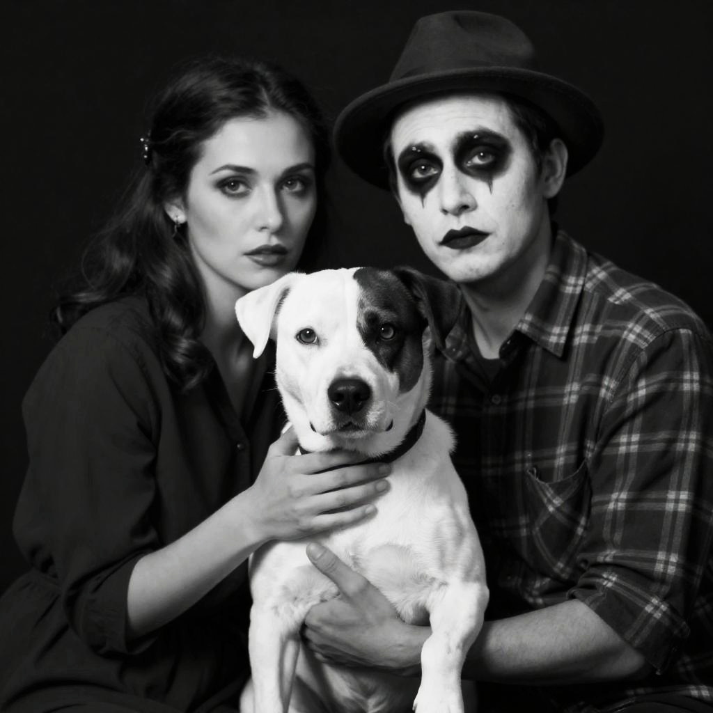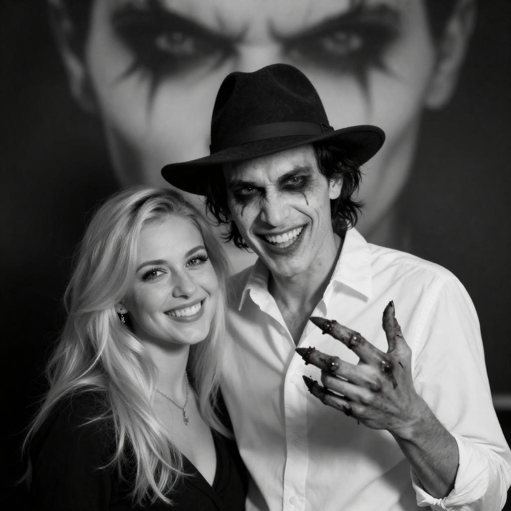 Black and white photograph of a man with a sinister expression wearing a large, dark hat, and a white shirt. He has blood-stained, claw-like fingers and is standing close to a smiling woman with long blonde hair. Both are in front of a dark, abstract background with a large, symmetrical pattern above them.