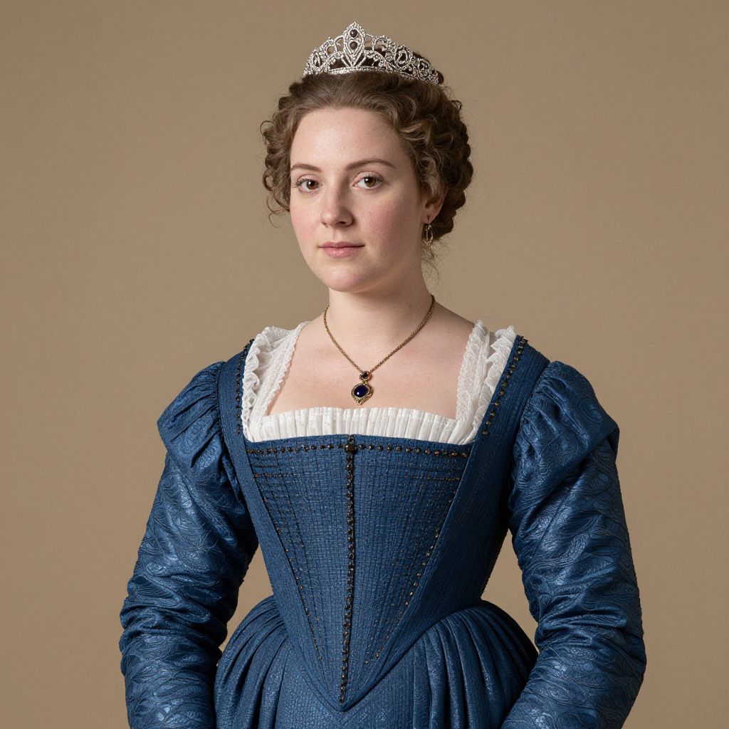 Photograph of a young Caucasian woman with fair skin and brown, curly hair, wearing an elaborate silver tiara. She is dressed in a blue, 18th-century-style gown with puffed sleeves, a square neckline, and a white lace trim. A black pendant necklace rests on her chest. The background is a plain, beige color. Her expression is calm and composed, with a slight smile. The texture of the gown appears to be rich, with subtle embroidery. The image is well-lit, highlighting the details of her clothing and accessories.