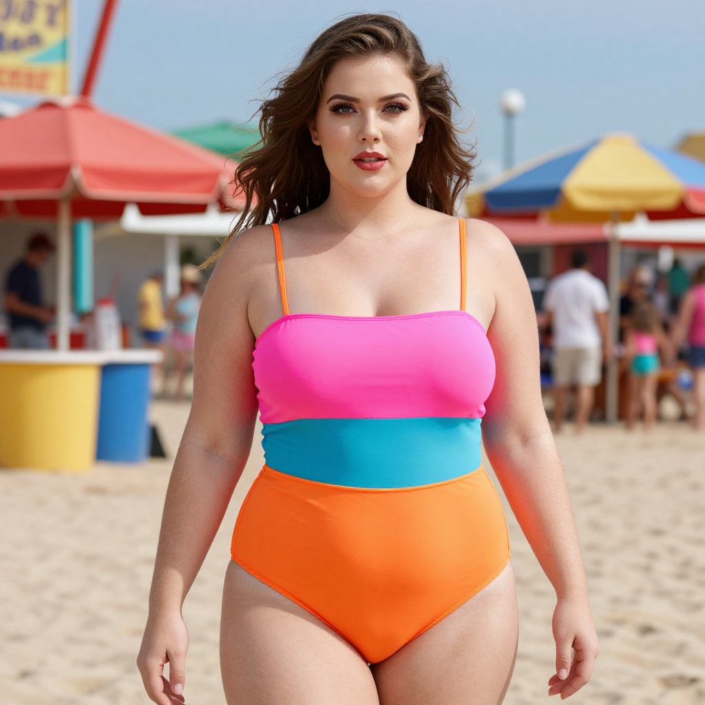 A Plus-size woman in a color-block two-piece swimsuit, bright pink bandeau top and orange bikini bottoms, minimal accessories, enjoying the vibrant atmosphere of a 1980s beach boardwalk, in the visual style of Juan Francisco Casas Ruiz. Sexy. Pretty face and beаutiful eyes. Big breasts