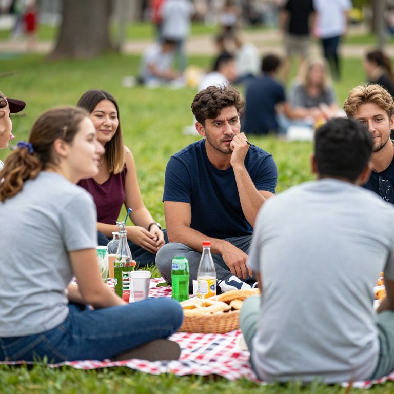 Menschen in einem Park beim Picknick, entspannt und fröhlich, unterschiedliche Altersgruppen und ethnische Herkunft, realistische Darstellung mit Fokus auf Gesichter und Emotionen, weiches Tageslicht