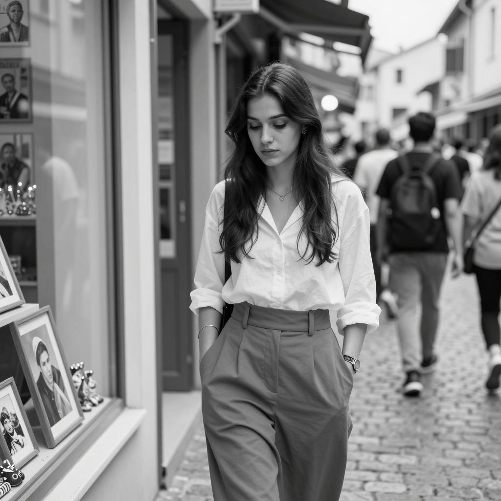 Black and white photograph. Young woman with long dark hair in white blouse and high-waisted skirt stands outside shop. Hands in pockets. Shop window with framed photos and small items. Cobblestone street. Crowded background, people walking. Woman looks downward.