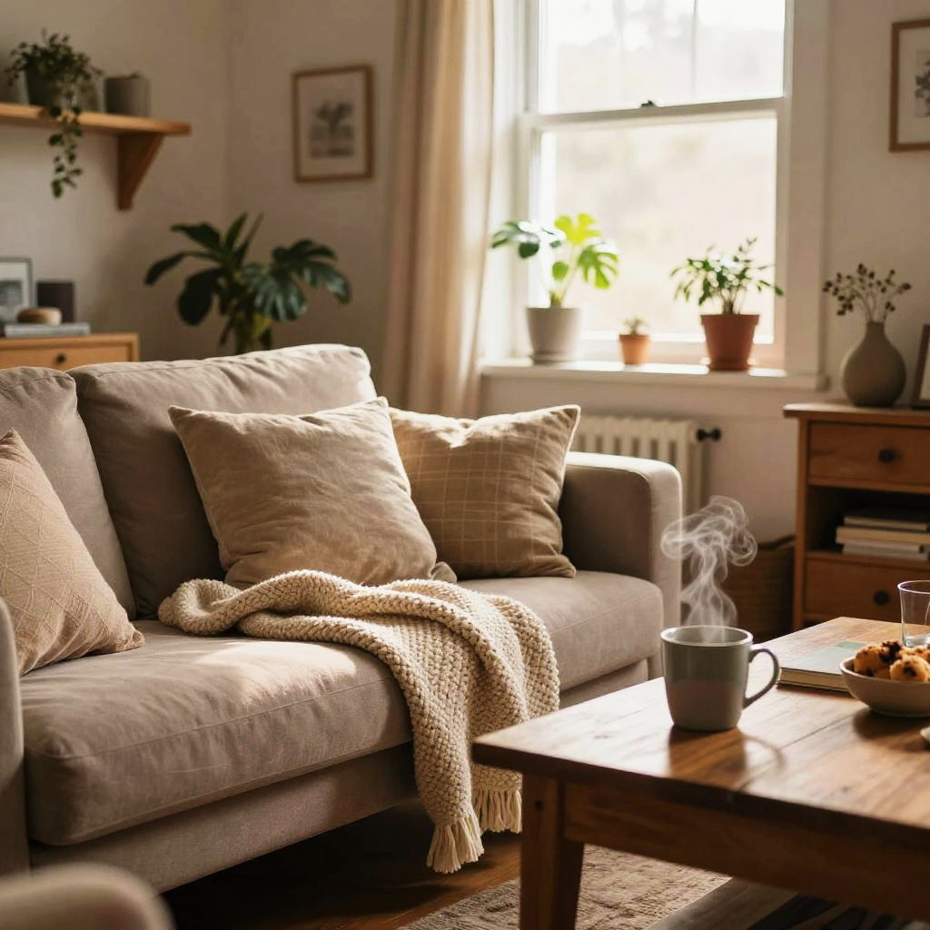 Homely cozy living room with warm lighting, rustic wooden furniture, soft cushions, a knitted blanket draped over a sofa, houseplants by the window, a steaming mug on the table, gentle afternoon sun filtering through curtains, warm and inviting atmosphere