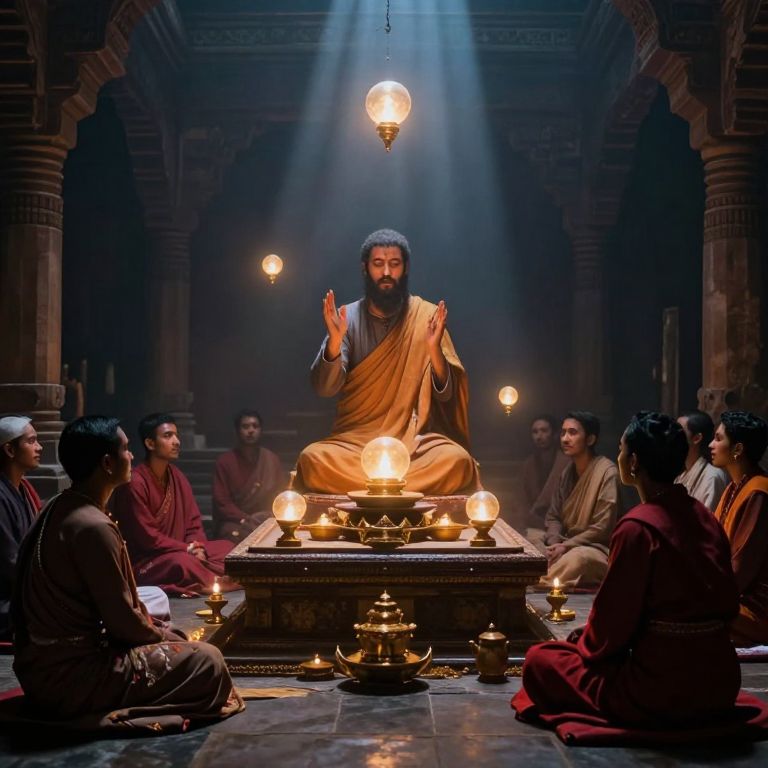 Faiths represented as glowing orbs floating above an ancient altar surrounded by devotees in traditional attire, rich textures and vibrant colors highlighting sacred traditions, mystical ambiance with beams of divine light piercing through a dark, foggy environment