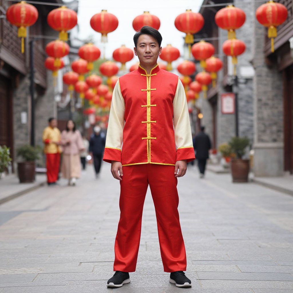 Photograph of an Asian man standing in the center of a narrow, cobblestone street decorated with red Chinese lanterns. He wears a vibrant red and gold traditional Chinese outfit with long sleeves and buttoned front, paired with matching red pants and black shoes. His black hair is neatly combed. The background features blurred figures of people, some also in traditional attire, and stone buildings with potted plants. The scene evokes a festive, cultural atmosphere. The lanterns create a vibrant red canopy overhead, contrasting with the gray stone walls.