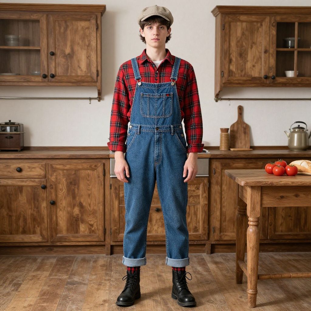 Full-body portrait of a wiry Mediterranean man with a buzz cut and beard, wearing denim overalls and brown boots, standing confidently inside a rustic farm barn with natural lighting and visible straw on the floor. The barn features wooden beams and stone walls, creating a detailed textured background.