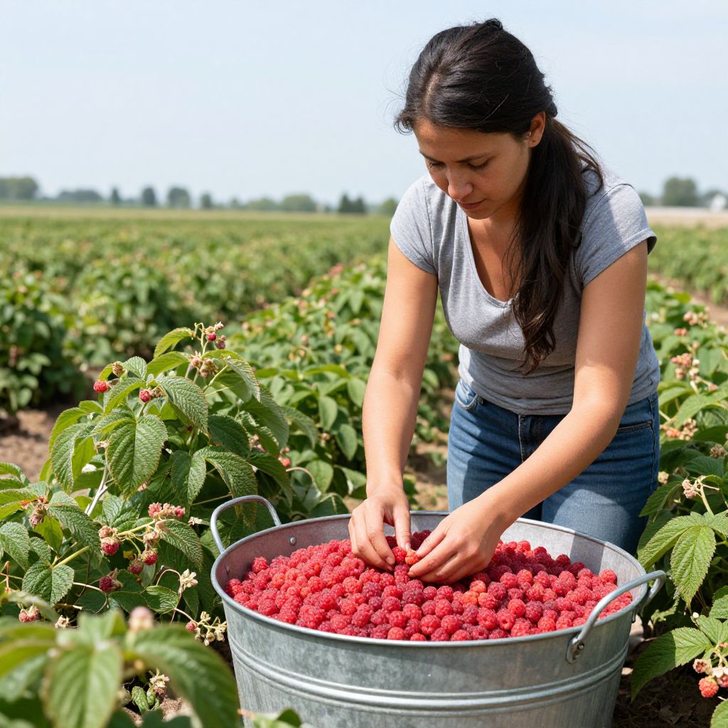 Woman harvesting vibrant red raspberries into a large metal container amidst rows of lush green raspberry plants under a bright, open sky.