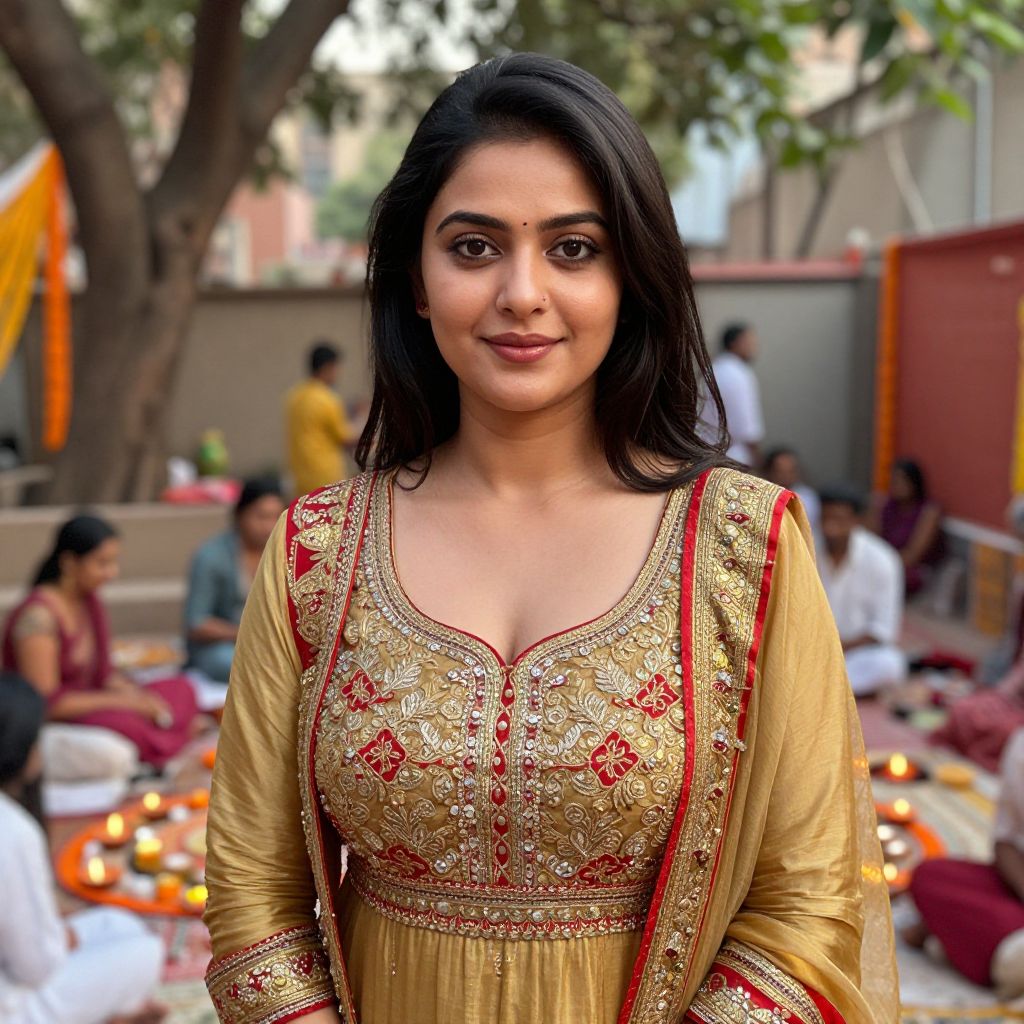A realistic photograph of a young Indian woman in her late 20s, with medium-length black hair and warm brown eyes, wearing a traditional cotton Banarasi costume with rich golden and red silk embroidery, standing in a vibrant henna-artist-filled courtyard during a festival in Varanasi, with soft sunlight filtering through the trees and decorative diyas glowing in the background.. The woman has big tits and cute face